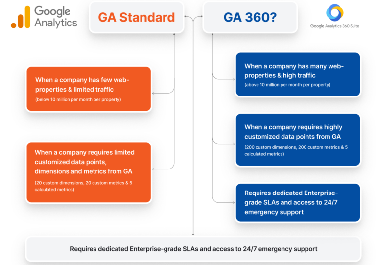 The Advanced version of Google Analytics, i.e Google analytics 360 provides tools and support for large enterprises. With more customization, scalable tools, and enterprise-level support, it assists marketers to gain a comprehensive perspective of their online marketing activities.
