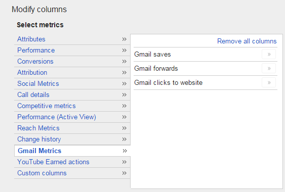 3. Gmail Ads offers a few unique reporting columns which are specific to the platform. These include reporting on the number of saves and forwards. An advertiser can acquire these indicators from the ‘Gmail Ads’ set of columns.