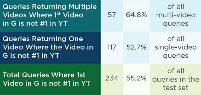 Apart from discovering that nearly more than 50% of the time the Google search results show different YouTube videos that has different ranking on YouTube, Enge also figured out that even when Google showed up only one video, more than 55% of the time, the same video would not show up first on YouTube for the same search query. In his hypothesis, Enge suggested that the ranking of the videos is different because the different websites have different goals that they have their own KPIs.
