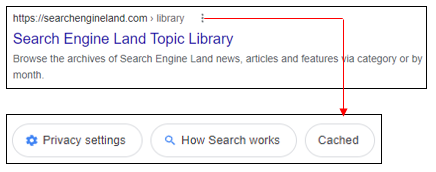 - Click on the three dots next to the page’s URL and click on ‘Cached‘