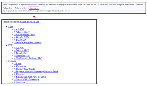 Alternatively, you can check the cached version of a specific page using the “cache:” operator (cache: example.com/example-url)