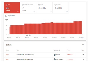 As seen from the above illustration, Google Search Console also provides valuable insights concerning indexed pages, including the presence of ‘no index’ tags, 404 pages, and server errors.